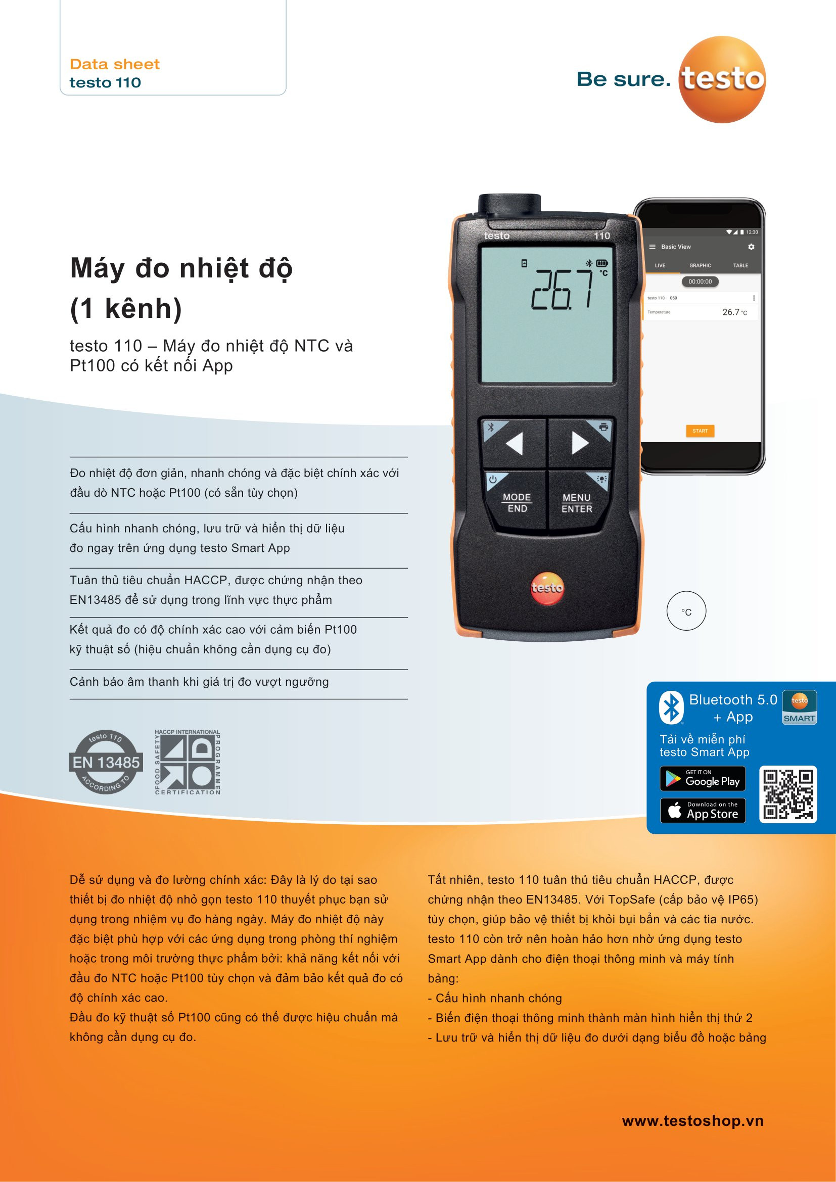 - Đo nhiệt độ đơn giản, nhanh chóng và đặc biệt chính xác với đầu dò NTC hoặc Pt100 (có sẵn tùy chọn) - Cấu hình nhanh chóng, lưu trữ và hiển thị dữ liệu đo ngay trên ứng dụng testo Smart App - Tuân thủ tiêu chuẩn HACCP, được chứng nhận theo EN13485 để sử dụng trong lĩnh vực thực phẩm - Kết quả đo có độ chính xác cao với cảm biến Pt100 kỹ thuật số (hiệu chuẩn không cần dụng cụ đo) - Cảnh báo âm thanh khi giá trị đo vượt ngưỡng