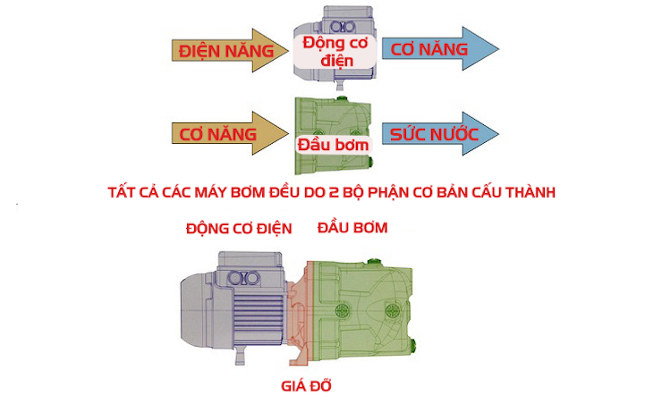Tất cả các loại máy bơm đều được tạo thành từ 2 bộ phận cơ bản là động cơ điện và đầu bơm. Động cơ điện có nhiệm vụ biến điện năng thành cơ năng và đầu bơm sẽ thực hiện chức năng biến cơ năng thành sức nước.