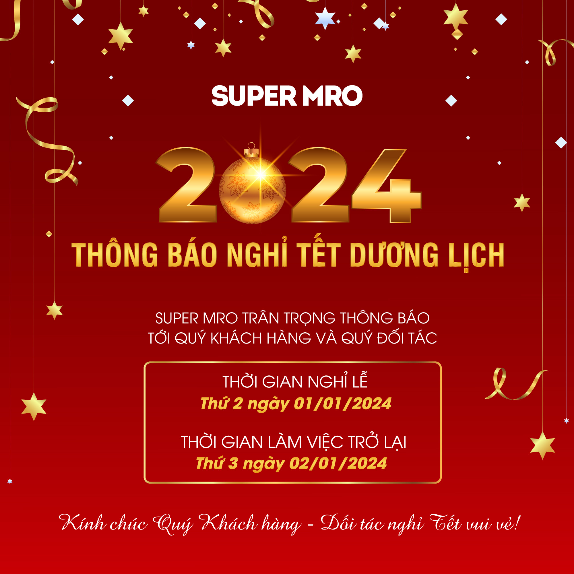 Super MRO xin trân trọng thông báo tới Quý khách hàng và Quý đối tác lịch nghỉ Tết Dương lịch 2024 cụ thể như sau: