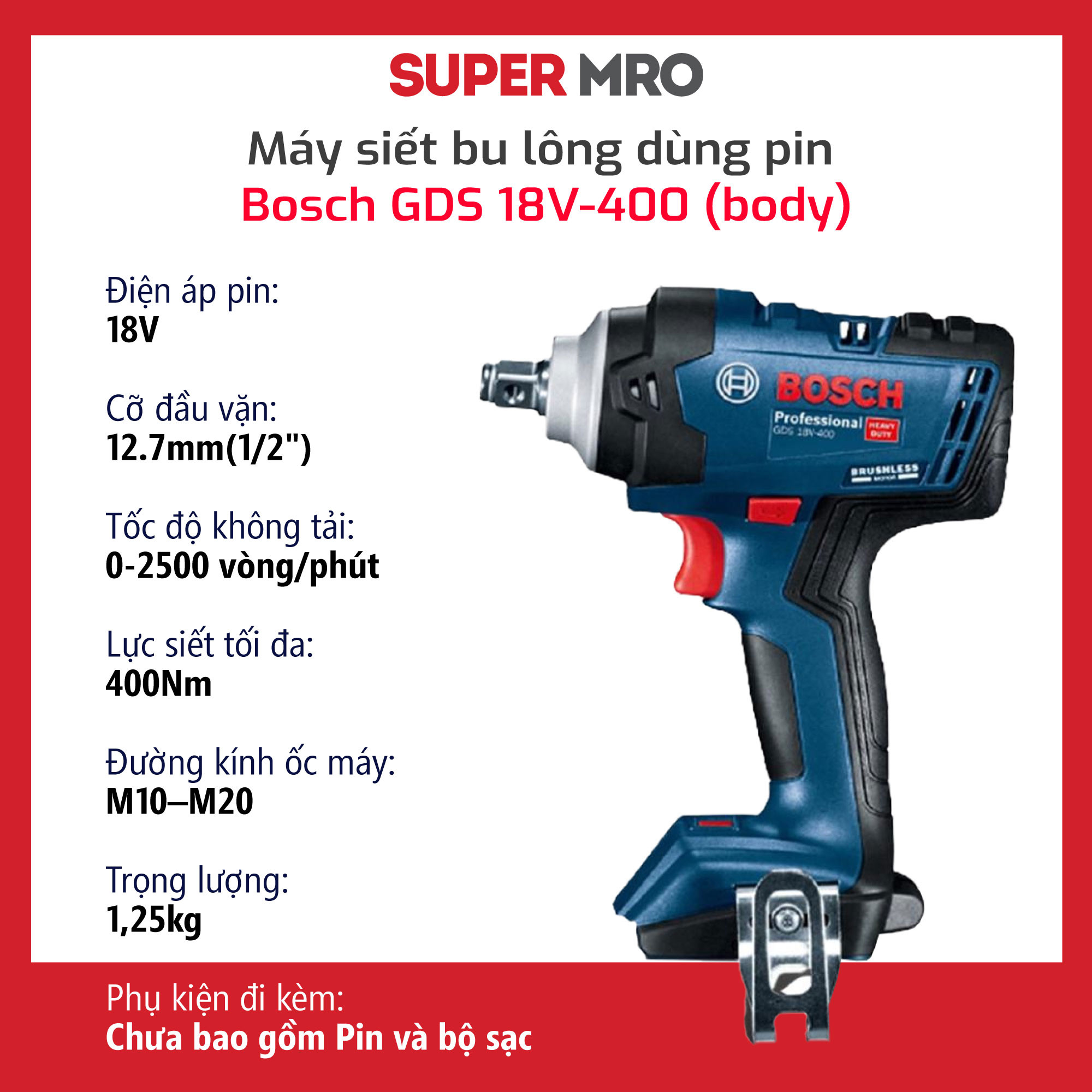 Đặt mua tại đây: https://super-mro.com/san-pham/1b0462-may-van-bu-long-dung-pin-bosch-gds-18v-400-body.html